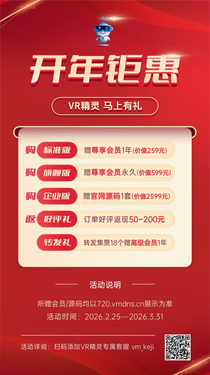 开年创作焕新季,VR精灵宠粉福利重磅来袭! 购买任意版本即送未米全景720.vmdns.cn尊享会员/官网源码,转发集赞再免费领年会员,双重豪礼加码,更核心的是——入手即解锁离线制作+在线展示双模式同步拥有的**优势,彻底打破VR创作的场景限制,让全景制作更灵活、作品落地更高效,从创作到展示一站式拉满,这波福利错过再等一年!